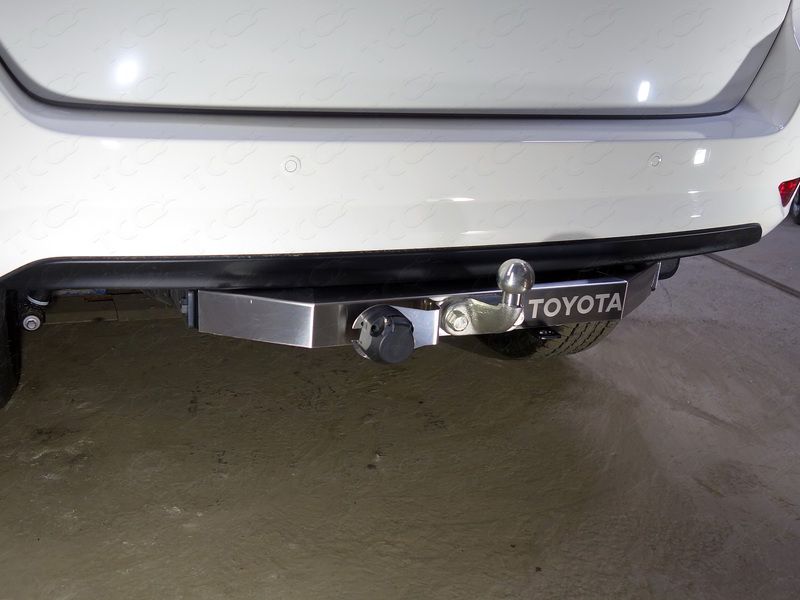Оцинкованный фаркоп с пластинами из нержавеющей стали с надписью TOYOTA. Горизонтальная нагрузка 1500 кг, вертикальная нагрузка 100 кг. Фаркоп подходит для автомобиля Toyota Fortuner (Тойота Фортунер) с 2017 года выпуска.