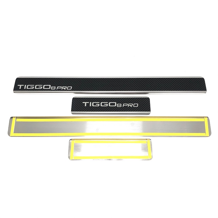 Накладки на пороги INOX Carbon из нержавеющей, полированной стали. Марка стали AISI 304, Италия. Накладки подходят для автомобиля Chery Tiggo 8 Pro (Чери Тигго 8 Про) с 2021 года выпуска.