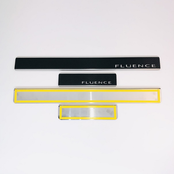 Накладки на пороги КАРБОН (с надписью Fluence) из нержавеющей, полированной стали. Марка стали AISI 304, Италия. Накладки на пороги подходят для автомобиля RENAULT Fluence (Рено Флюенс) с 2010 года выпуска.
