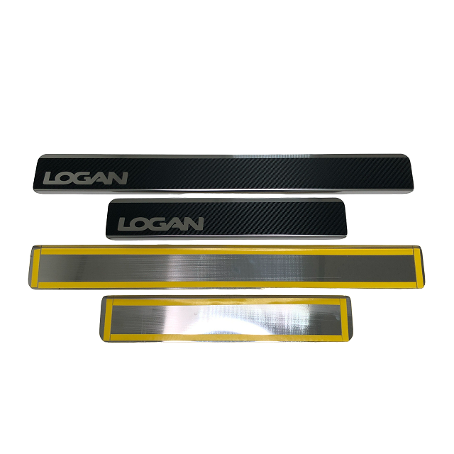 Накладки на пороги КАРБОН (с надписью Logan) из нержавеющей, полированной стали. Марка стали AISI 304, Италия. Накладки на пороги подходят для автомобиля RENAULT Logan (Рено Логан) с 2004 года выпуска.