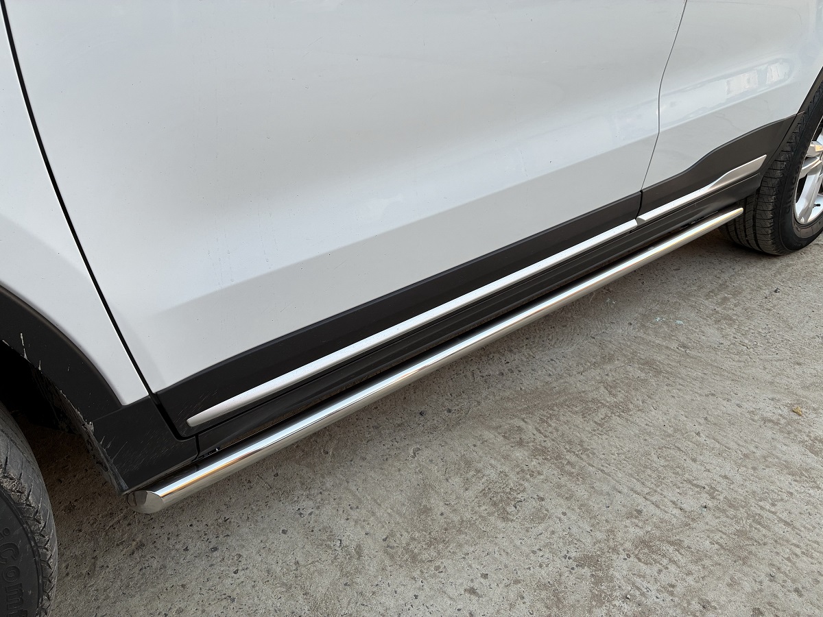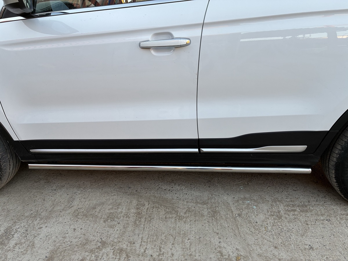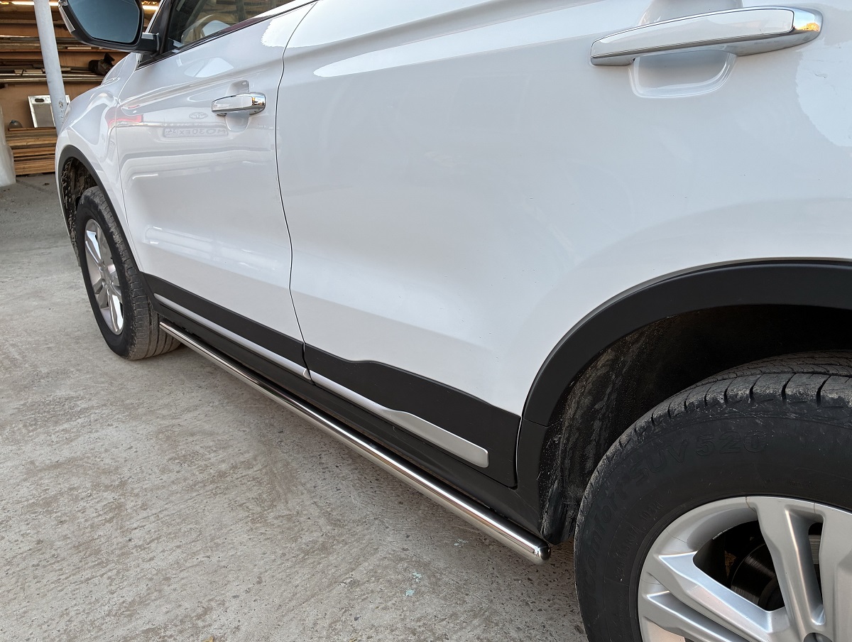 Пороги труба из нержавеющей, полированной стали. Диаметр трубы 42 мм. Толщина стенки 1,5 мм. Марка стали AISI 304, Италия. Пороги подходят для автомобиля BELGEE X70 с 2024 модельного года.
