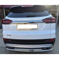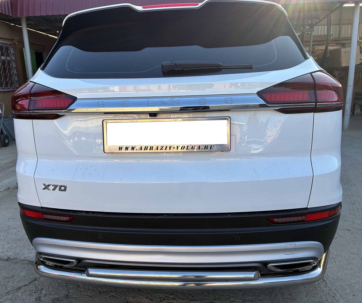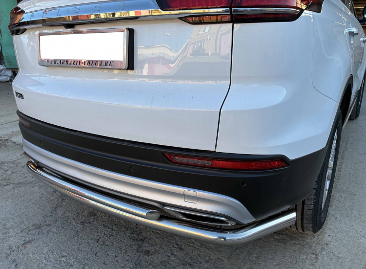 Защита заднего бампера двойная с загибами из нержавеющей, полированной стали. Диаметр трубы 60-42 мм. Толщина стенки 1,5 мм. Марка стали AISI 304, Италия. Защита подходит для автомобиля BELGEE X70 с 2024 года выпуска.