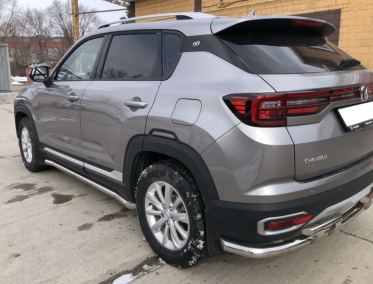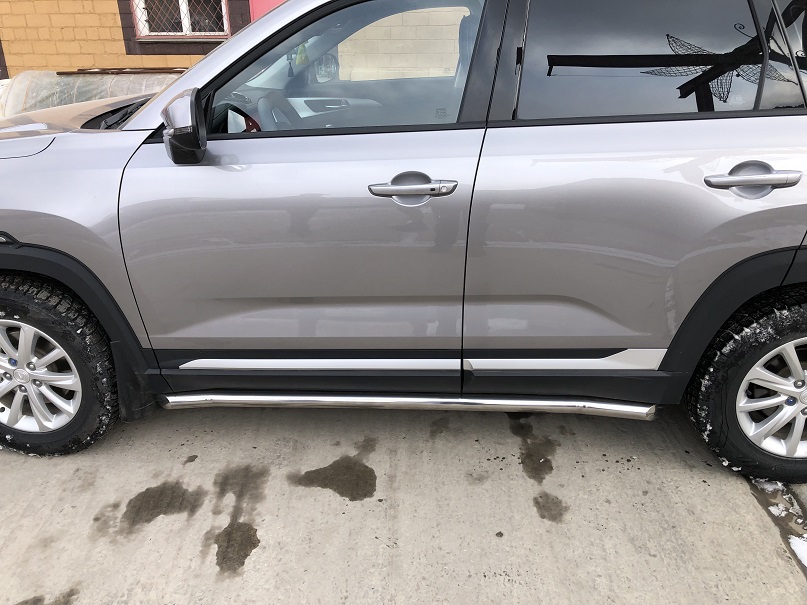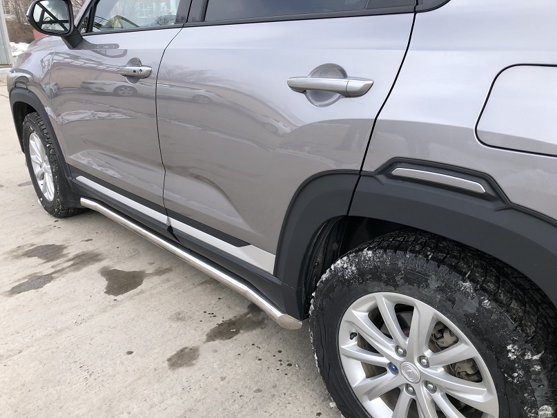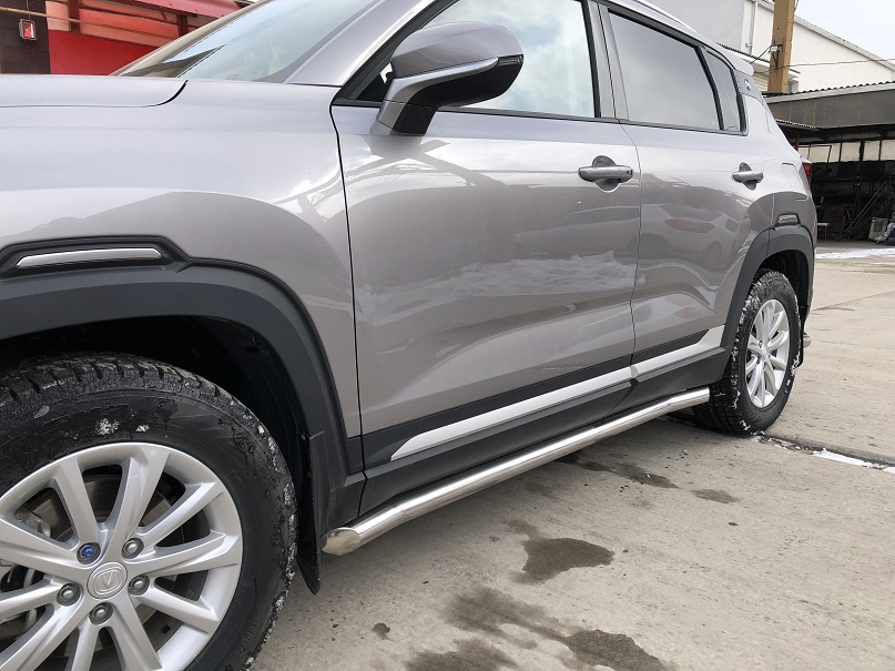 Пороги труба из нержавеющей, полированной стали. Диаметр трубы 60 мм. Толщина стенки 1,5 мм. Марка стали AISI 304, Италия. Пороги подходят для автомобиля CHANGAN CS35 Plus (ЧАНГАН CS35 Плюс) с 2018 по 2022 года выпуска.