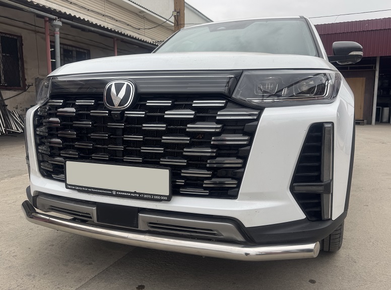 Защита переднего бампера из нержавеющей, полированной стали. Диаметр трубы 60 мм. Толщина стенки 1,5 мм. Марка стали AISI 304, Италия. Защита бампера подходит для автомобиля CHANGAN CS95 (ЧАНГАН CS95) с 2023 года выпуска.
