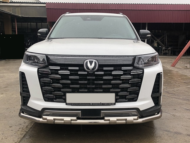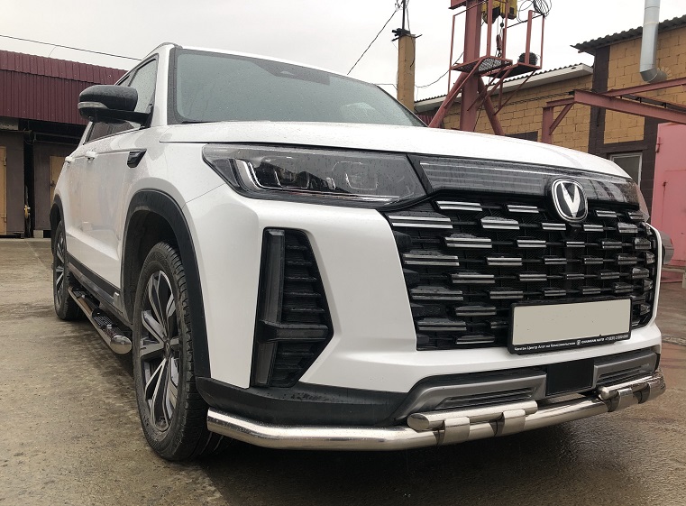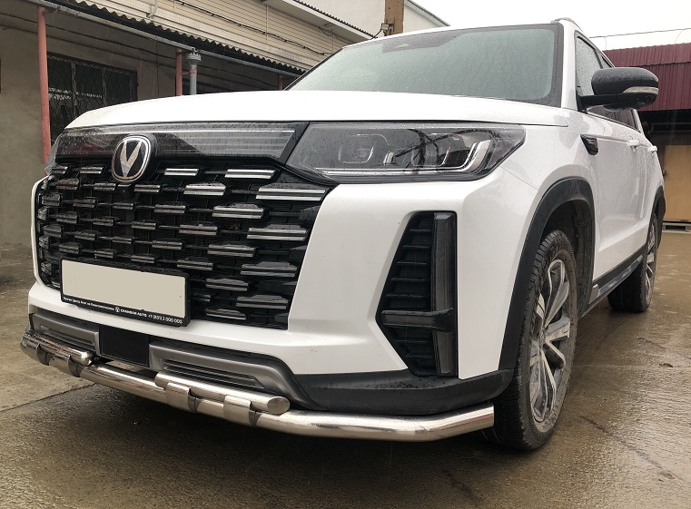 Защита переднего бампера двойная с перемычками из нержавеющей, полированной стали. Диаметр трубы 60-42 мм. Толщина стенки 1,5 мм. Марка стали AISI 304, Италия. Защита бампера подходит для автомобиля CHANGAN CS95 (ЧАНГАН CS95) с 2023 года выпуска.