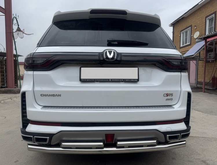 Защита заднего бампера двойная из нержавеющей, полированной стали. Диаметр трубы 60-42 мм. Толщина стенки 1,5 мм. Марка стали AISI 304, Италия. Защита бампера подходит для автомобиля CHANGAN CS95 (ЧАНГАН CS95) с 2023 года выпуска.
