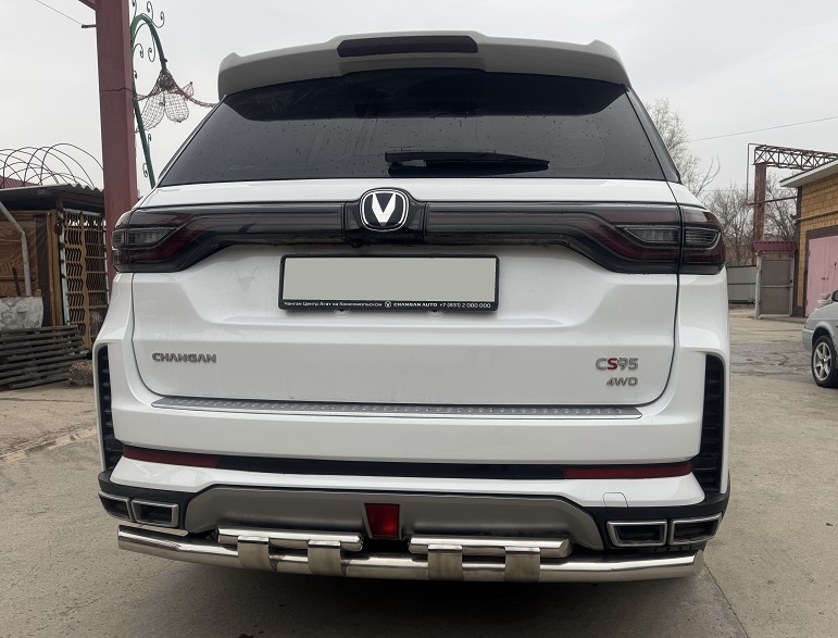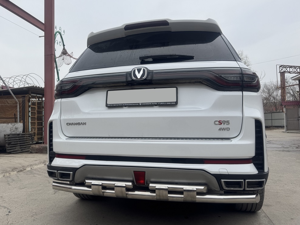 Защита заднего бампера двойная с перемычками из нержавеющей, полированной стали. Диаметр трубы 60-42 мм. Толщина стенки 1,5 мм. Марка стали AISI 304, Италия. Защита бампера подходит для автомобиля CHANGAN CS95 (ЧАНГАН CS95) с 2023 года выпуска.