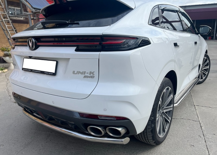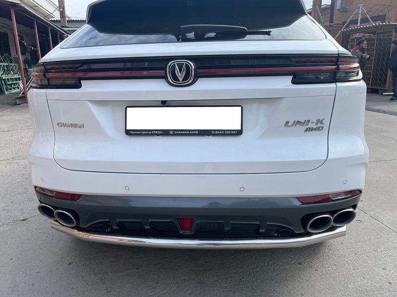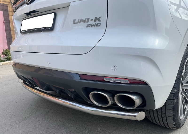 Защита заднего бампера из нержавеющей, полированной стали. Диаметр трубы 60 мм. Толщина стенки 1,5 мм. Марка стали AISI 304, Италия. Защита бампера подходит для автомобиля CHANGAN UNI-K (ЧАНГАН ЮниК) с 2022 года выпуска.