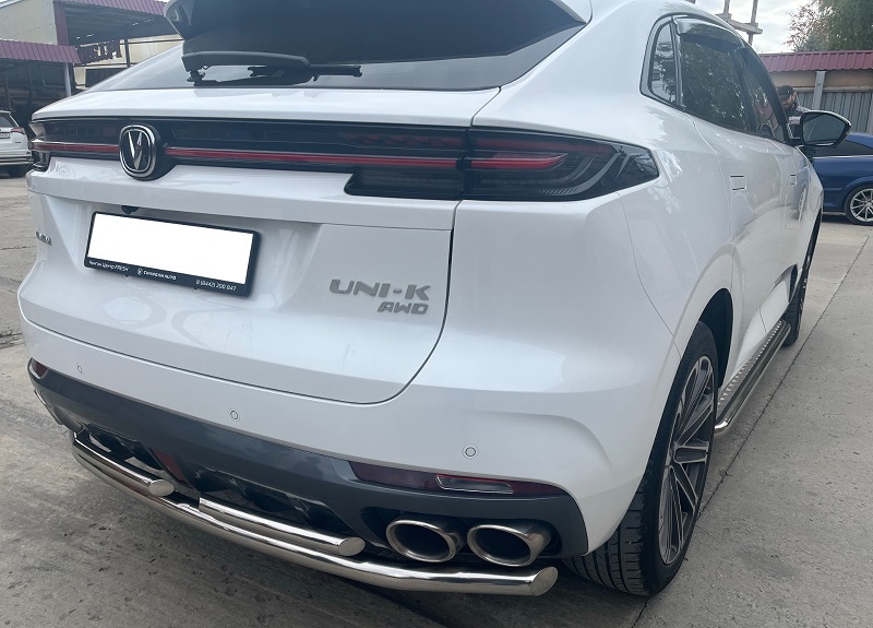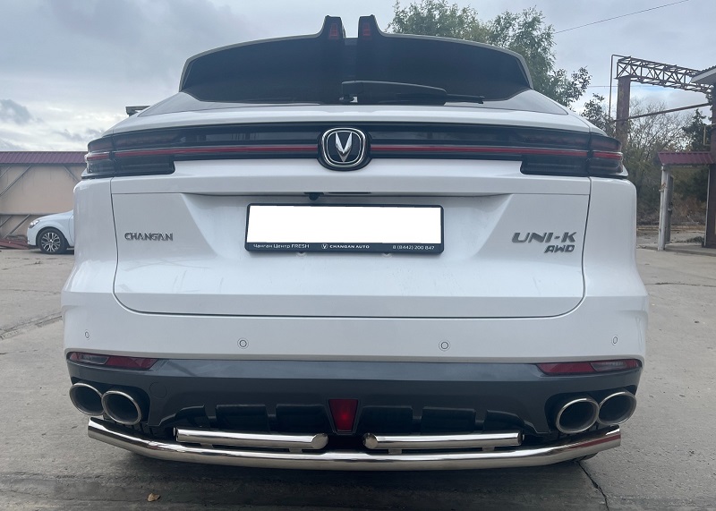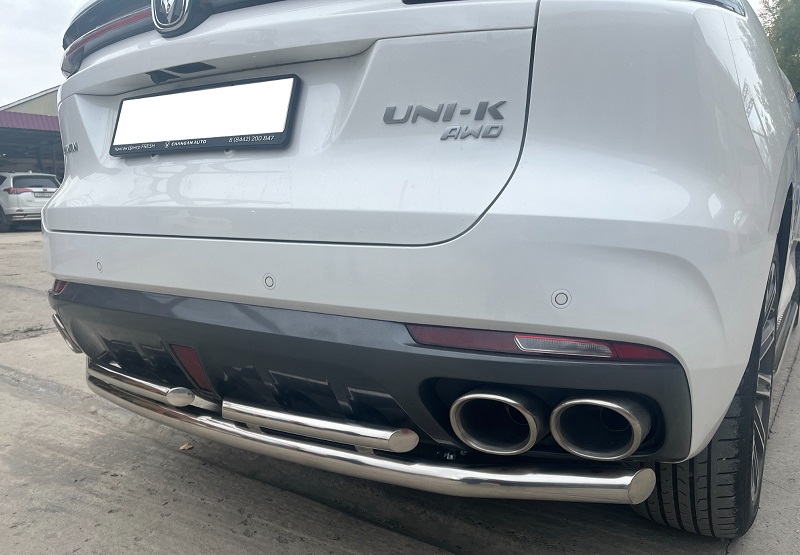 Защита заднего бампера двойная из нержавеющей, полированной стали. Диаметр трубы 60-42 мм. Толщина стенки 1,5 мм. Марка стали AISI 304, Италия. Защита бампера подходит для автомобиля CHANGAN UNI-K (ЧАНГАН ЮниК) с 2022 годп выпуска.