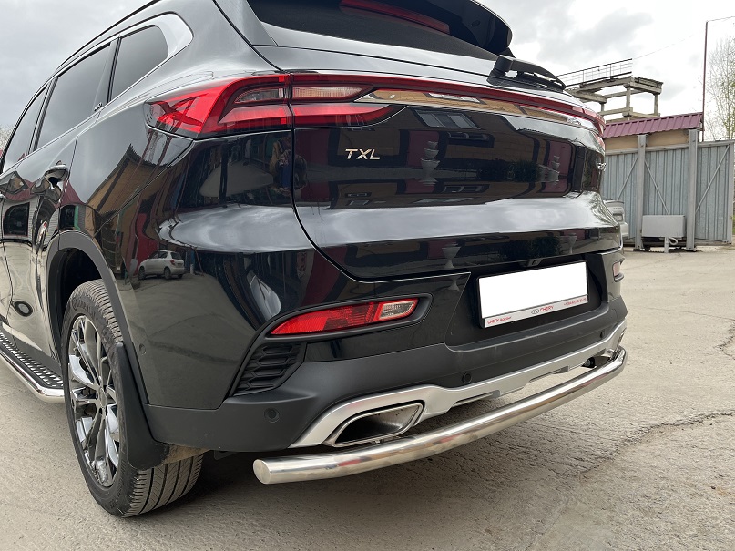 Защита заднего бампера из нержавеющей, полированной стали. Диаметр трубы 53 мм. Толщина стенки 1,5 мм. Марка стали AISI 304, Италия. Защита бамперов подходит для автомобиля Chery Exeed TXL (Чери Эксид TXL) с 2020 года выпуска.