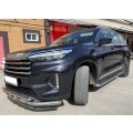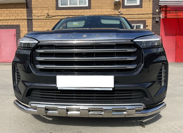 Защита переднего бампера двойная с перемычками из нержавеющей, полированной стали. Диаметр трубы 60-42 мм. Толщина стенки 1,5 мм. Марка стали AISI 304, Италия. Защита бампера подходит для автомобиля Chery Exeed VX (Чери Эксид VX) с 2022 года выпуска.