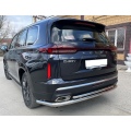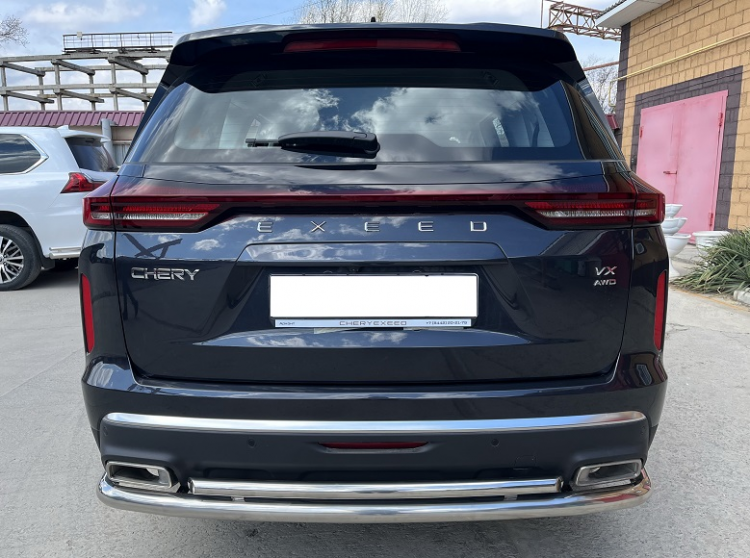 Защита заднего бампера угловая большая двойная из нержавеющей, полированной стали. Диаметр трубы 60-42 мм. Толщина стенки 1,5 мм. Марка стали AISI 304, Италия. Защита бамперов подходит для автомобиля Chery Exeed VX (Чери Эксид VX) с 2022 года выпуска.