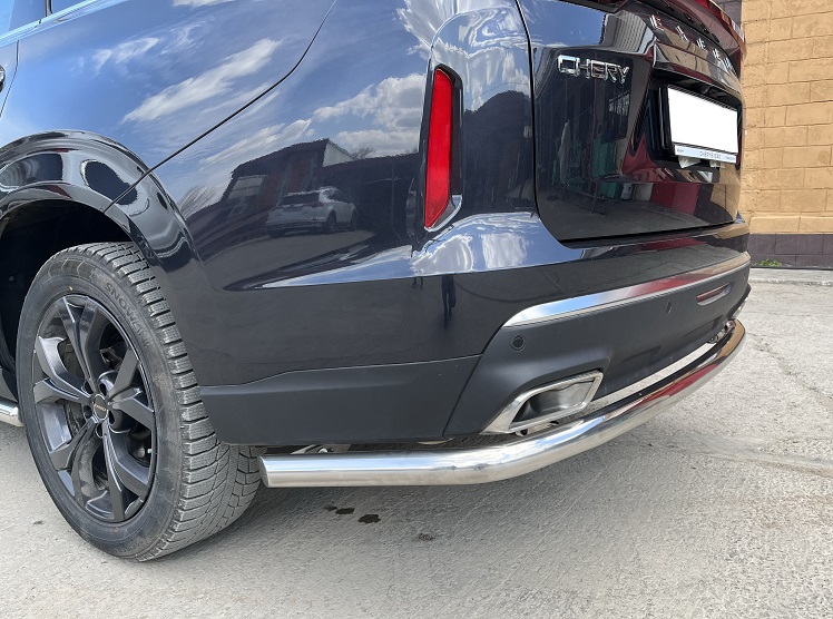 Защита заднего бампера угловая большая из нержавеющей, полированной стали. Диаметр трубы 60 мм. Толщина стенки 1,5 мм. Марка стали AISI 304, Италия. Защита бамперов подходит для автомобиля Chery Exeed VX (Чери Эксид VX) с 2022 года выпуска.