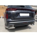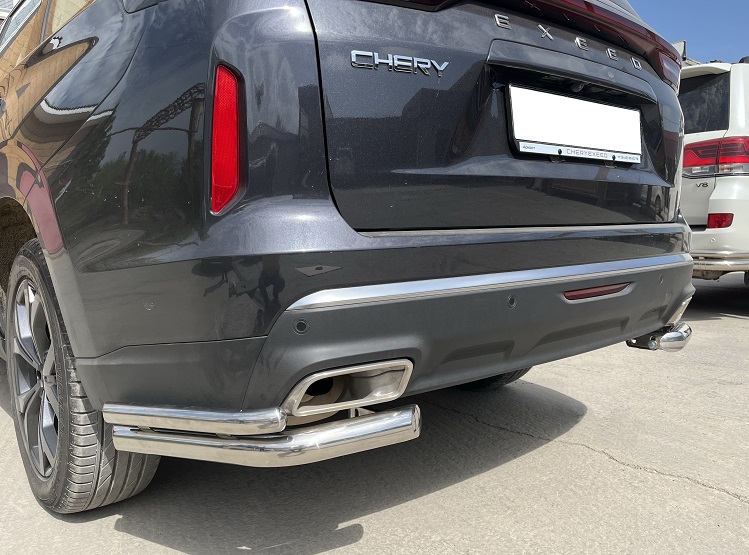 Защита заднего бампера "уголки двойные" из нержавеющей, полированной стали. Диаметр трубы 60-42 мм. Толщина стенки 1,5 мм. Марка стали AISI 304, Италия. Защита бамперов подходит для автомобиля Chery Exeed VX (Чери Эксид VX) с 2022 года выпуска.