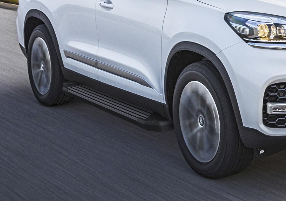 Пороги авто алюминиевые BLACK с полипропиленовыми накладками. Пороги подходят для автомобиля Chery Tiggo 8 (Чери Тигго 8) с 2020 года выпуска.