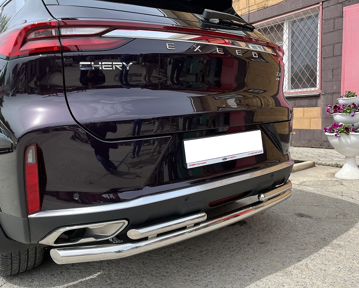 Защита заднего бампера двойная с перемычками из нержавеющей, полированной стали. Диаметр трубы 60-42 мм. Толщина стенки 1,5 мм. Марка стали AISI 304, Италия. Защита бамперов подходит для автомобиля Chery Omoda C5 (Чери Омода Ц5) с 2022 года выпуска.