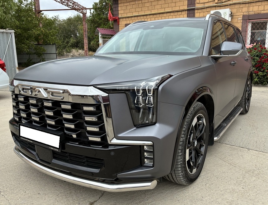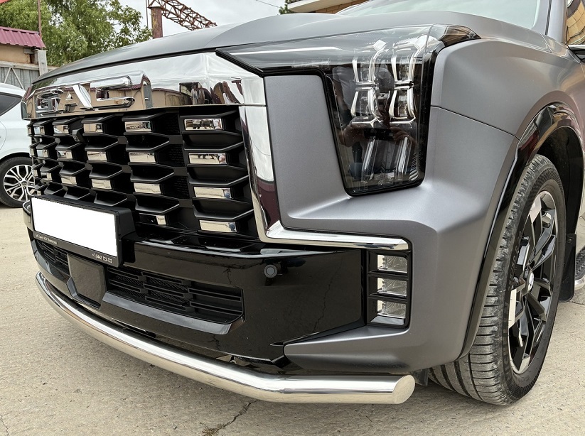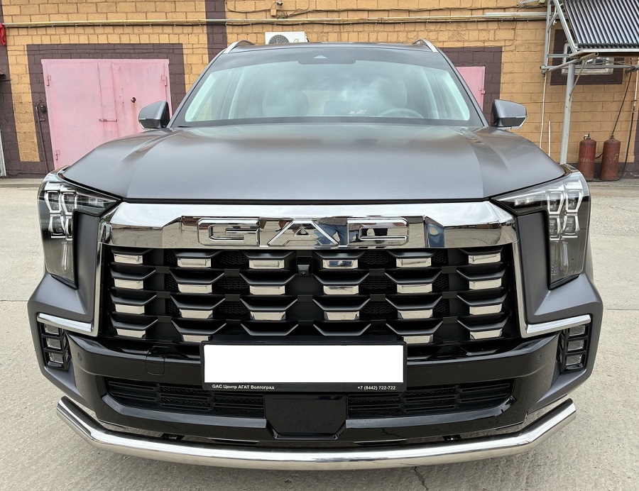Защита переднего бампера из нержавеющей, полированной стали. Диаметр трубы 60 мм. Толщина стенки 1,5 мм. Марка стали AISI 304, Италия. Защита бампера подходит для автомобиля GAC GS8 с 2025 года выпуска (комплектация Traveller).
