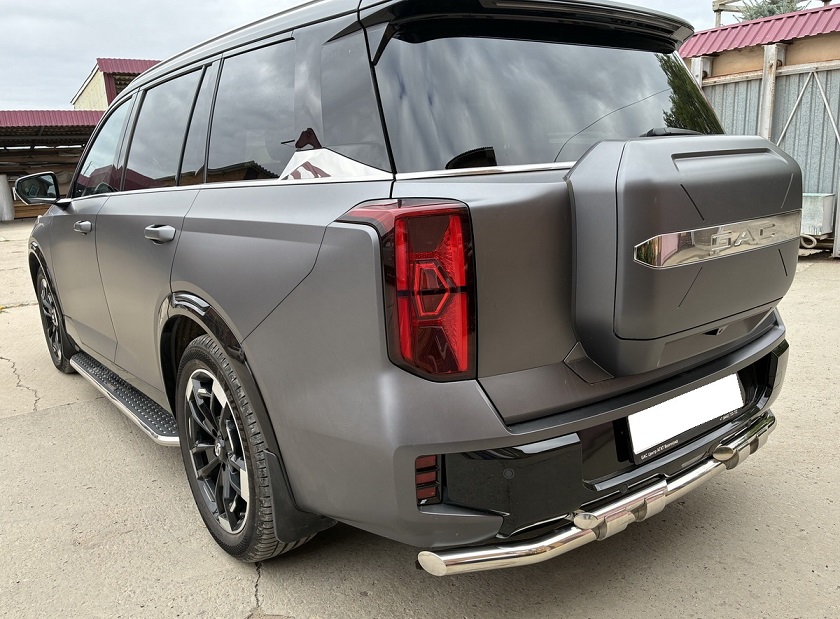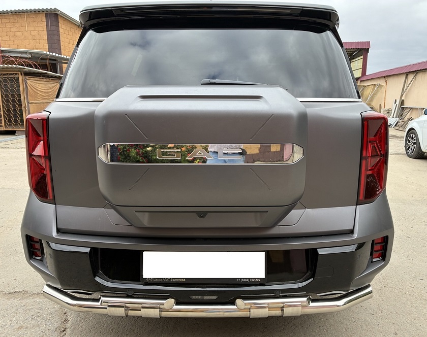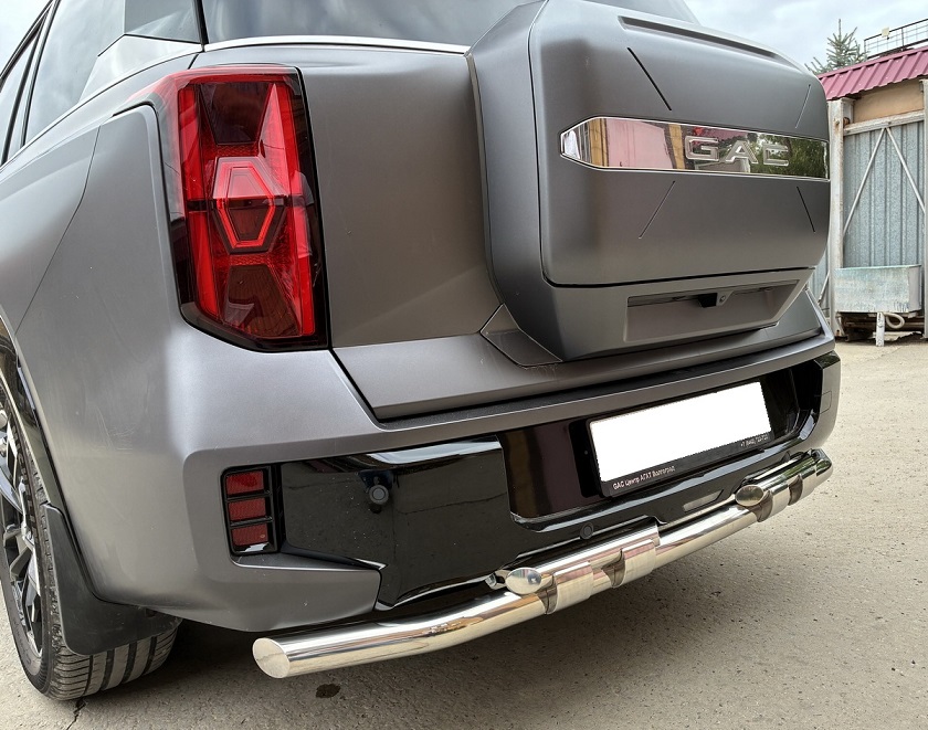 Защита заднего бампера двойная с перемычками из нержавеющей, полированной стали. Диаметр трубы 60-42 мм. Толщина стенки 1,5 мм. Марка стали AISI 304, Италия. Защита подходит для автомобиля GAC GS8 с 2025 года выпуска (комплектация Traveller).