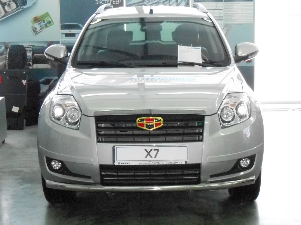 Защита переднего бампера из нержавеющей, полированной стали. Диаметр трубы 60 мм. Толщина стенки 1.5 мм. Марка стали AISI 304, Италия. Защита бампера подходит для автомобиля Geely Emgrand X7 (Джили Эмгранд Х7) с 2011 по 2016 год выпуска.