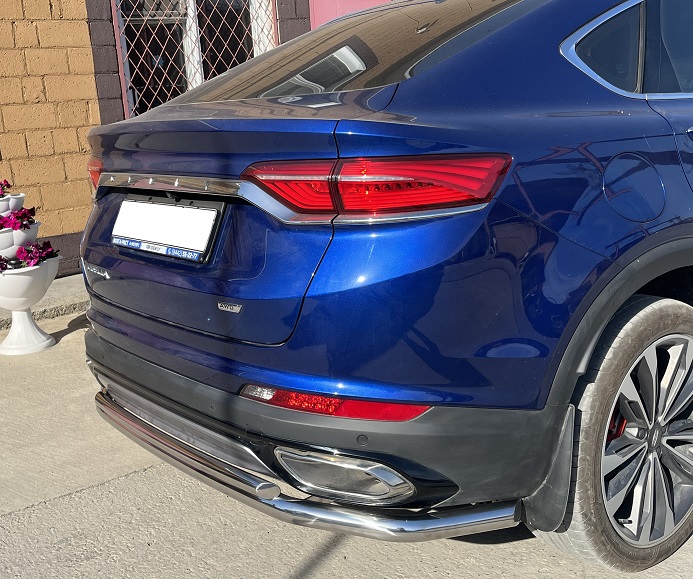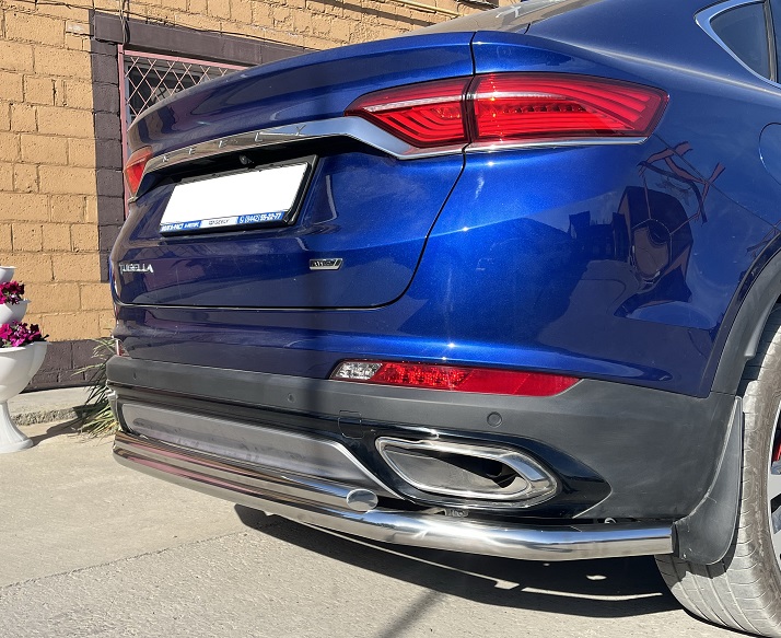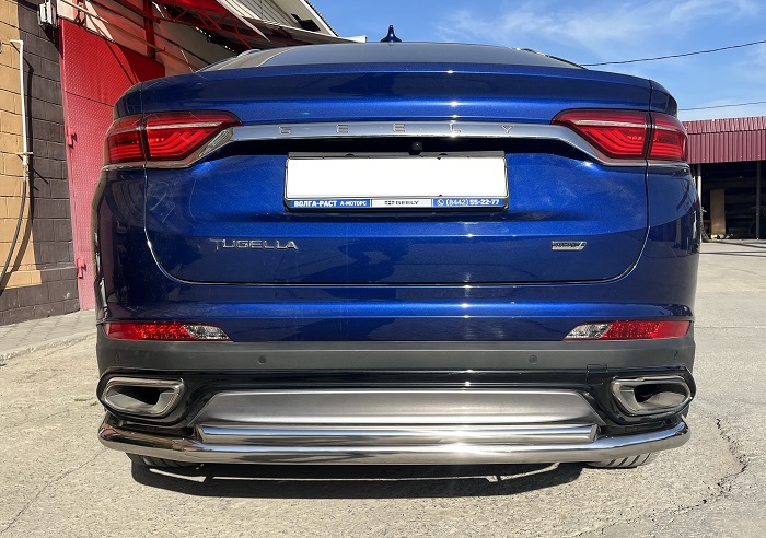 Защита заднего бампера двойная угловая большая из нержавеющей, полированной стали. Диаметр трубы 60-42 мм. Толщина стенки 1,5 мм. Марка стали AISI 304, Италия. Защита подходит для автомобиля GEELY Tugella (Джили Туггела) с 2021 года выпуска.