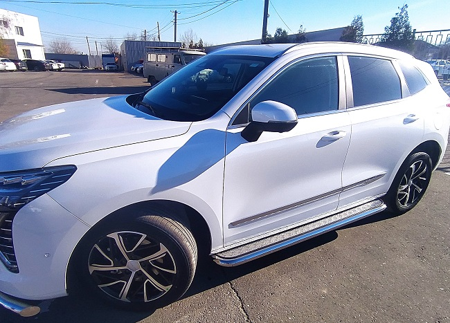 Пороги площадкой из нержавеющей, полированной стали с алюминиевым листом. Диаметр трубы 42 мм. Толщина стенки 1,5 мм. Марка стали AISI 304, Италия. Пороги подходят для автомобиля HAVAL Jolion (Хавал Джулиан) с 2024 года выпуска.