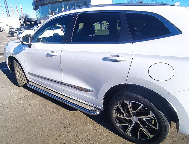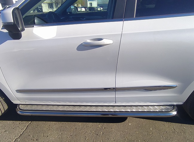 Пороги площадкой из нержавеющей, полированной стали с алюминиевым листом. Диаметр трубы 60 мм. Толщина стенки 1,5 мм. Марка стали AISI 304, Италия. Пороги подходят для автомобиля HAVAL Jolion (Хавал Джулиан) с 2021 года выпуска.