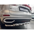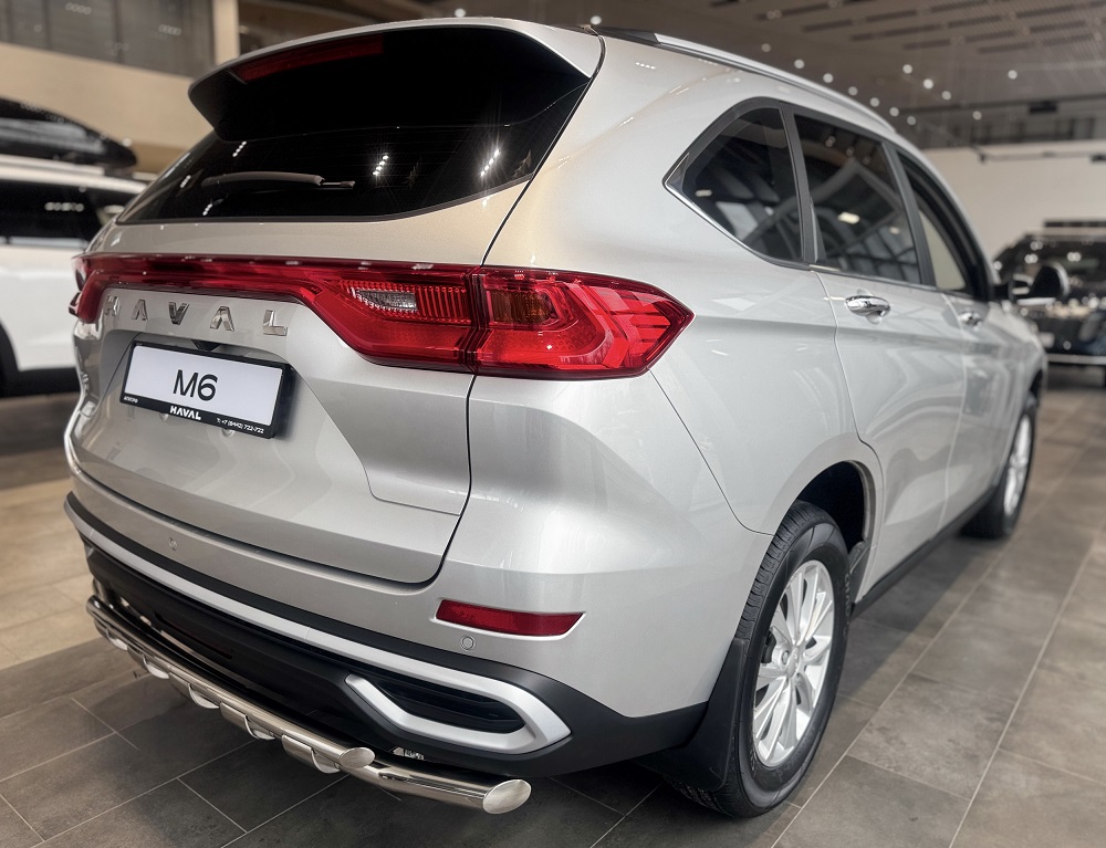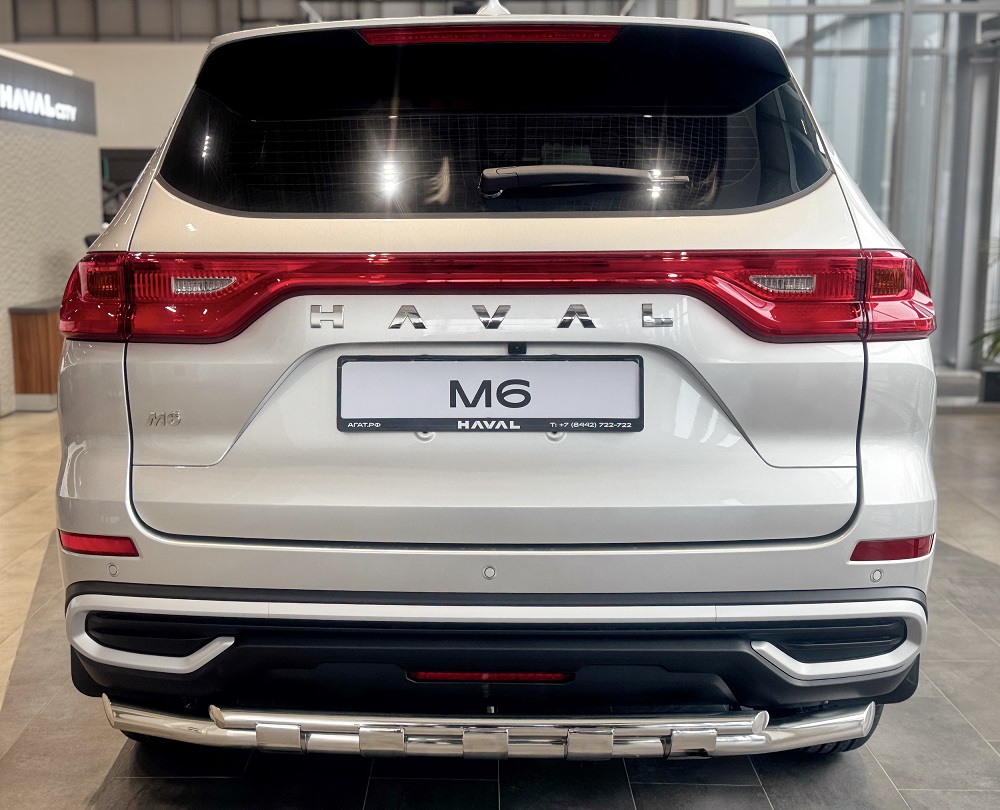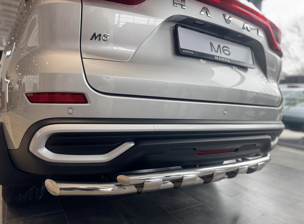 Защита заднего бампера двойная с перемычками из нержавеющей, полированной стали. Диаметр трубы 60-42 мм. Толщина стенки 1,5 мм. Марка стали AISI 304, Италия. Защита бампера подходит для автомобиля HAVAL М6 с 2023 года выпуска.