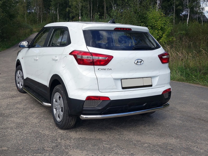 Защита заднего бампера из нержавеющей, полированной стали. Диаметр трубы 60 мм. Толщина стенки 1,5 мм. Марка стали AISI 304, Италия. Защита бампера подходит для автомобиля Hyundai Creta (Хендай Крета) с 2016 года выпуска.