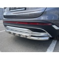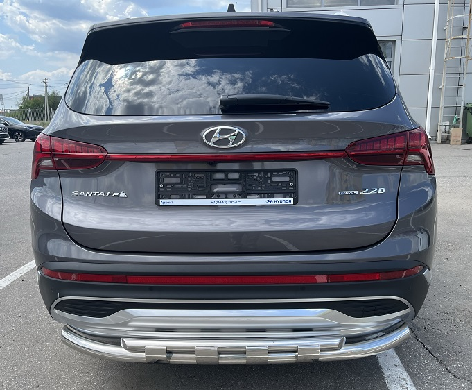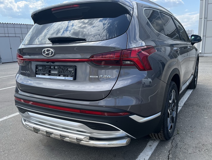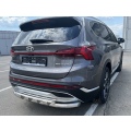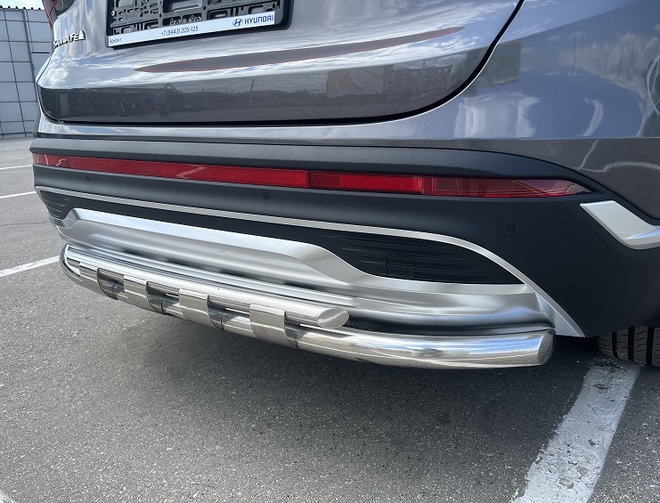 Защита заднего бампера двойная с перемычками из нержавеющей, полированной стали. Диаметр трубы 60-42 мм. Толщина стенки 1,5 мм. Марка стали AISI 304, Италия. Защита бампера подходит для автомобиля HYUNDAI Santa Fe (Хендай Санта Фе) с 2021 года выпуска.