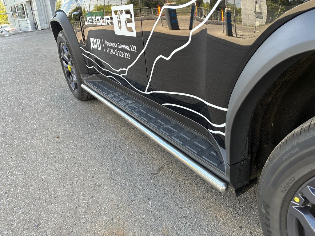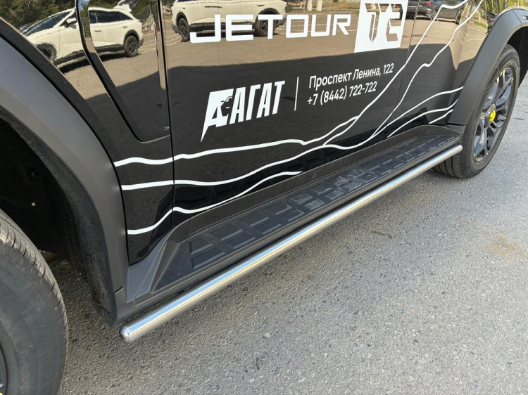 Пороги труба из нержавеющей, полированной стали. Диаметр трубы 42 мм. Толщина стенки 1,5 мм. Марка стали AISI 304, Италия. Пороги подходят для автомобиля Jetour T2 с 2024 года выпуска.