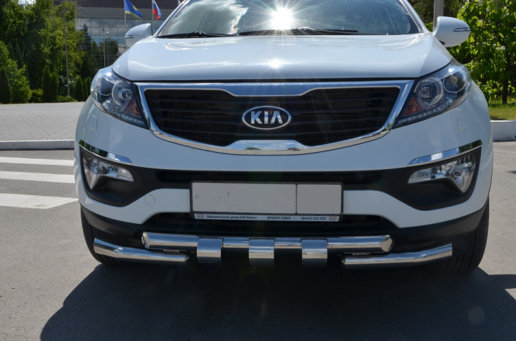 Защита переднего бампера двойная "с зубьями" из нержавеющей стали. Диаметр трубы 60-60 мм. Подходит для автомобиля KIA Sportage (Киа Спортейдж) с 2010 года.