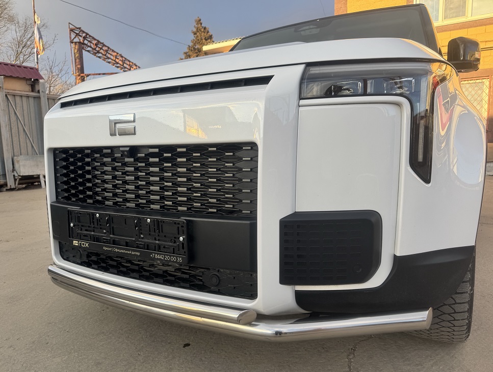 Защита переднего бампера двойная из нержавеющей, полированной стали. Диаметр трубы 60-42 мм. Толщина стенки 1,5 мм. Марка стали AISI 304, Италия. Защита бампера подходит для автомобиля ROX 01 с 2024 года выпуска.