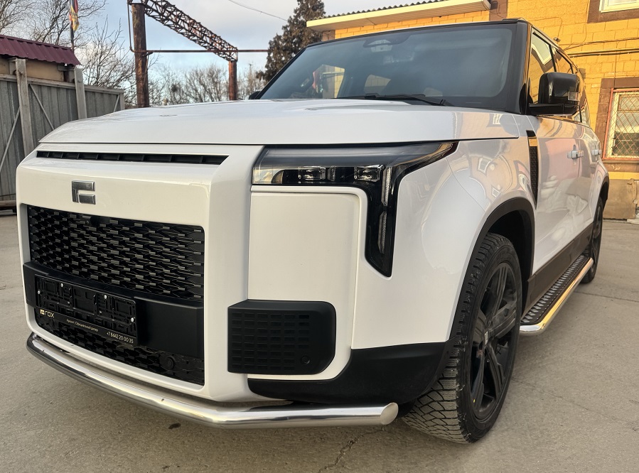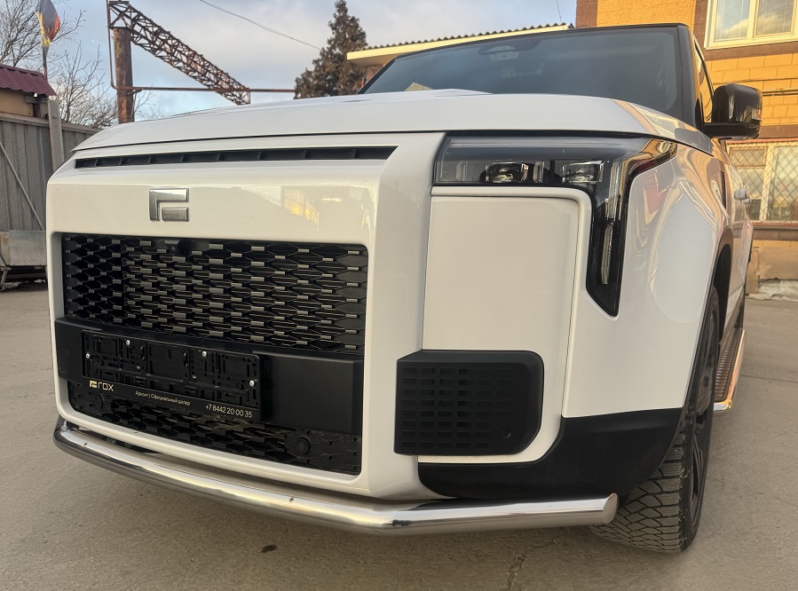 Защита переднего бампера из нержавеющей, полированной стали. Диаметр трубы 60 мм. Толщина стенки 1,5 мм. Марка стали AISI 304, Италия. Защита бампера подходит для автомобиля ROX 01 с 2024 года выпуска.