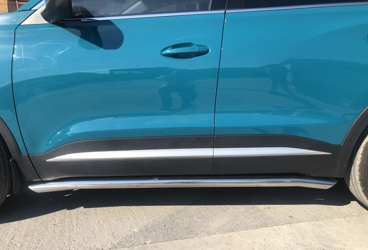 Пороги труба из нержавеющей, полированной стали. Диаметр трубы 60 мм. Толщина стенки 1,5 мм. Марка стали AISI 304, Италия. Пороги подходят для автомобиля TENET T7 с 2025 модельного года.