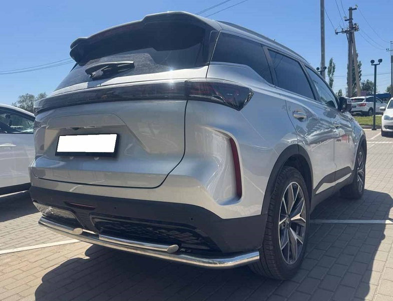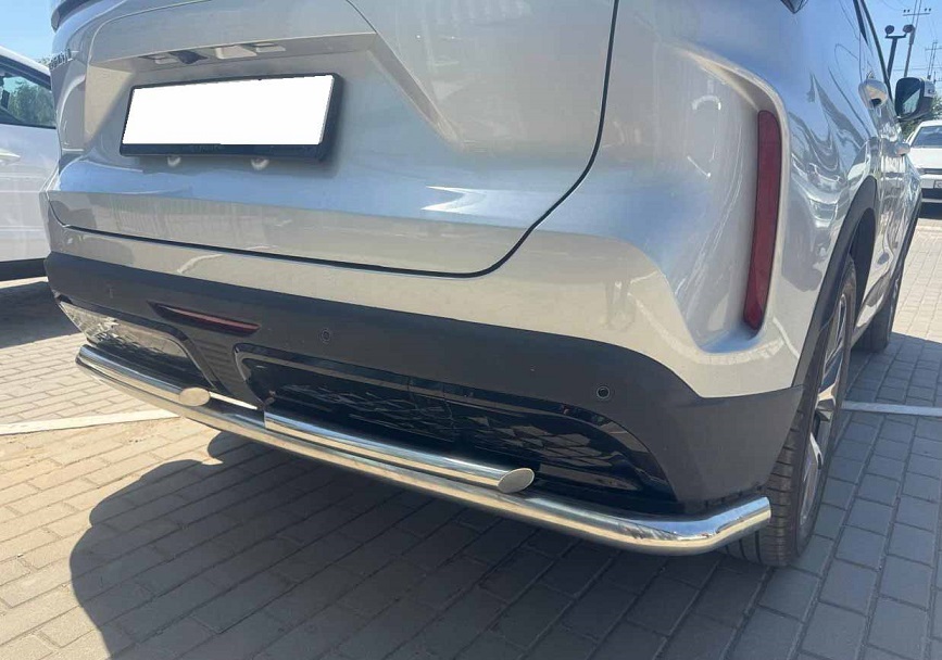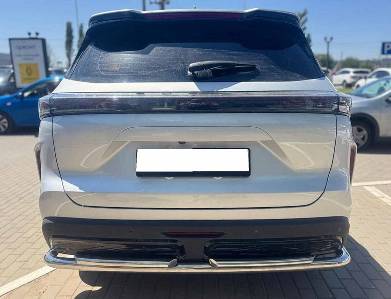 Защита заднего бампера двойная с загибами из нержавеющей, полированной стали. Диаметр трубы 60-42 мм. Толщина стенки 1,5 мм. Марка стали AISI 304, Италия. Защита подходит для автомобиля TENET T7 с 2025 года выпуска.