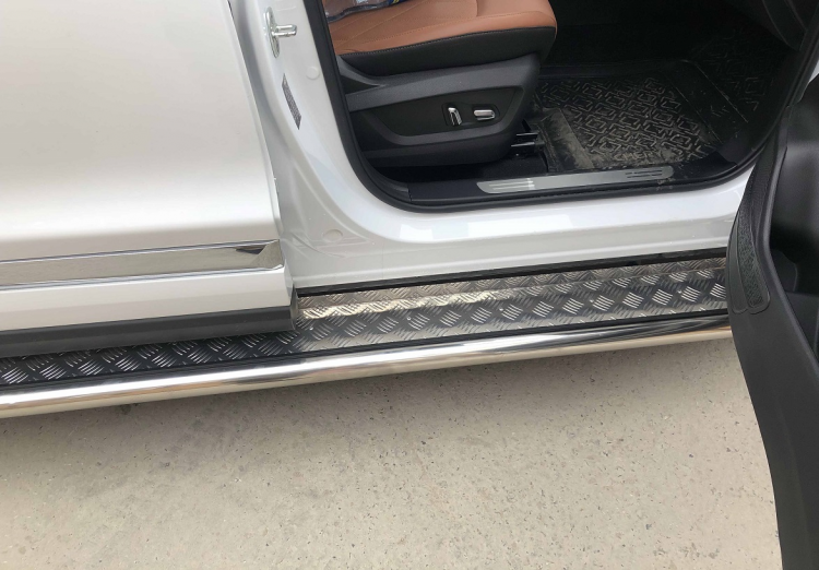 Пороги для авто площадкой из нержавеющей, полированной стали с алюминиевым листом. Диаметр трубы 53 мм. Толщина стенки 1,5 мм. Марка стали AISI 304, Италия. Пороги подходят для автомобиля Xcite X-Cross 8 с 2025 года выпуска.
