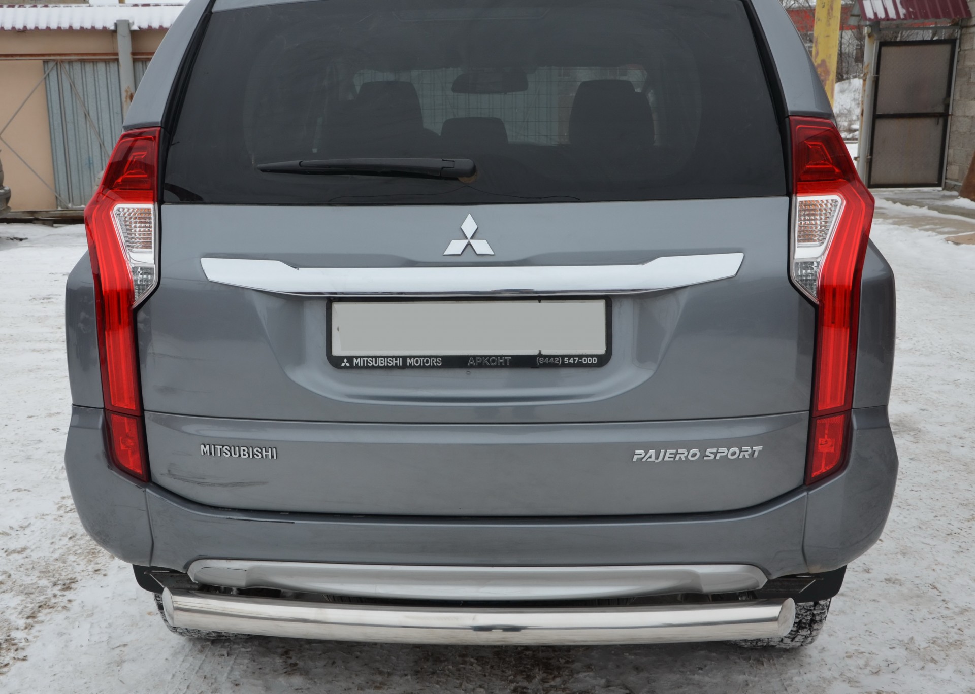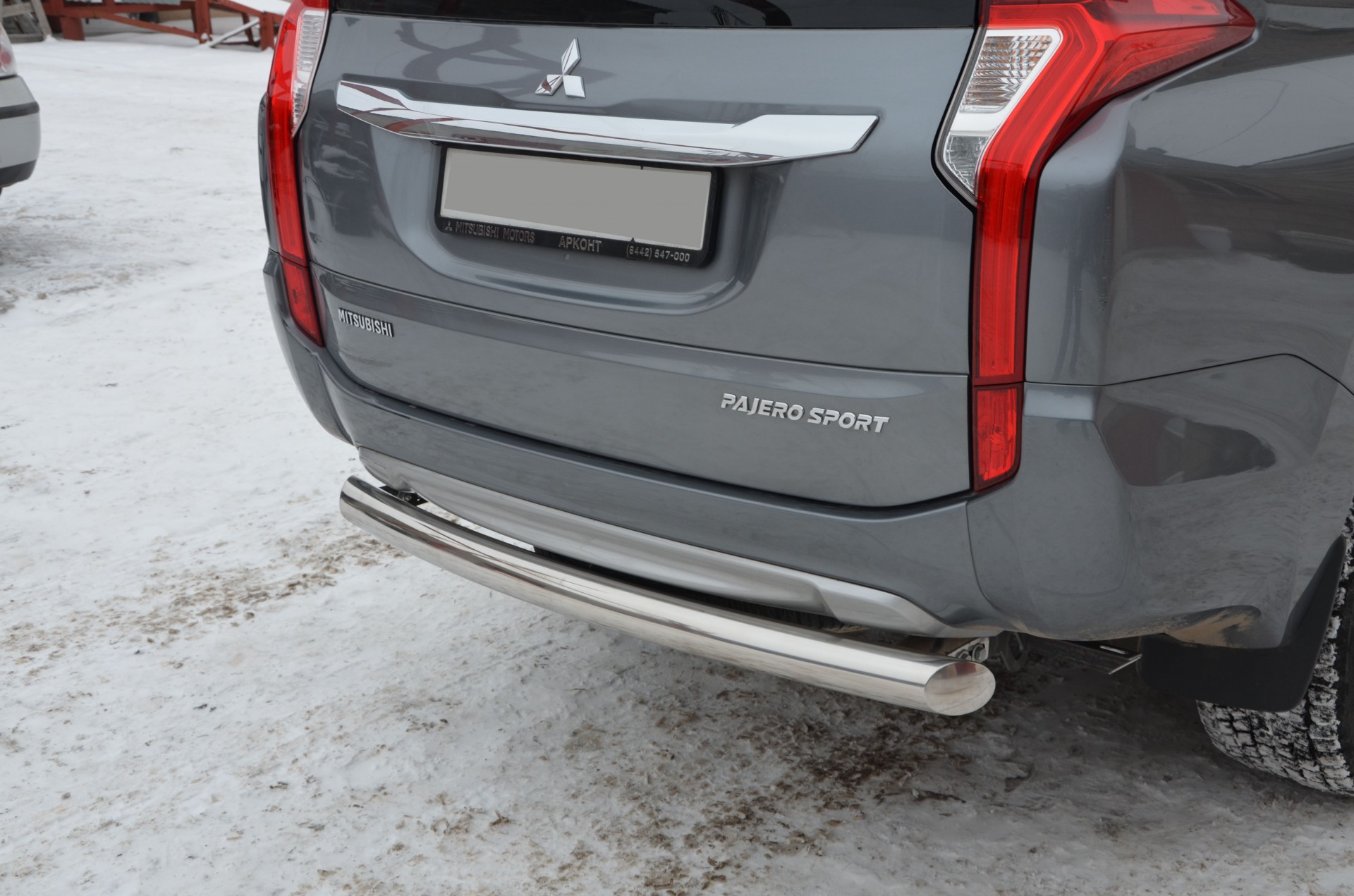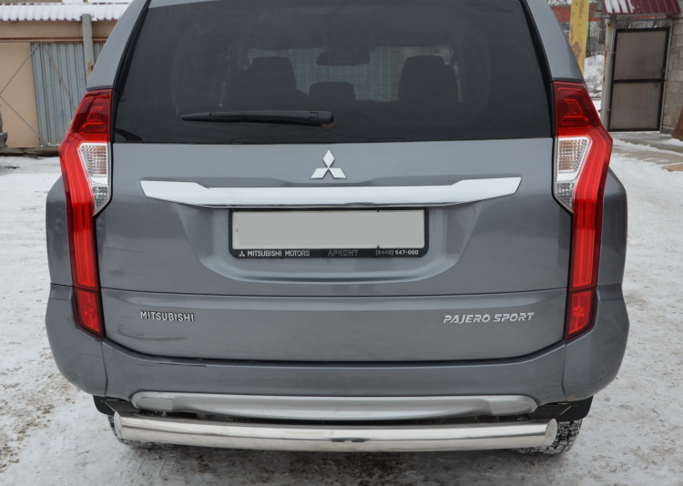 Защита заднего бампера из нержавеющей, полированной стали. Диаметр трубы 76 мм. Толщина стенки 1,5 мм. Марка стали AISI 304, Италия. Защита заднего бампера подходит для автомобиля MITSUBISHI Pajero Sport (Митсубиши Паджеро Спорт) с 2016 года выпуска.