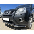 Защита переднего бампера двойная с перемычками из нержавеющей, полированной стали. Диаметр трубы 60-42 мм, толщина стенки 1.5 мм. Марка стали AISI 304, Италия. Защита переднего бампера подходит для автомобиля NISSAN X-Trail (Ниссан Х-Трейл) c 2011 по 2015 год выпуска.