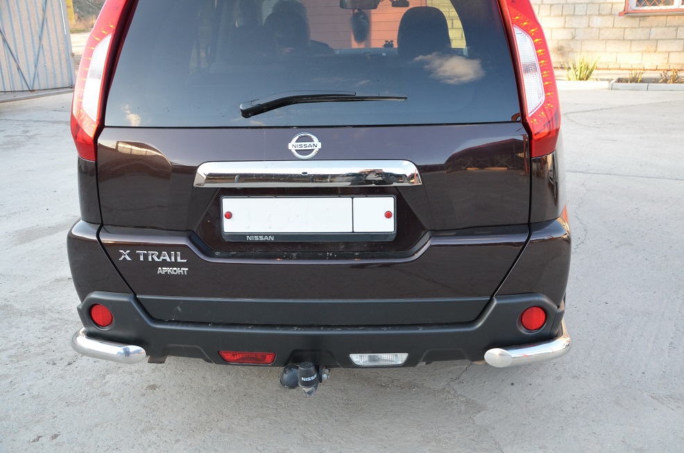 Защита заднего бампера из нержавеющей, полированной стали "Уголки". Диаметр трубы 60 мм. Толщина стенки 1,5 мм. Марка стали AISI 304, Италия. Защита бампера подходит для автомобиля NISSAN X-Trail (Ниссан Х-Трейл) c 2011 по 2015 год выпуска.