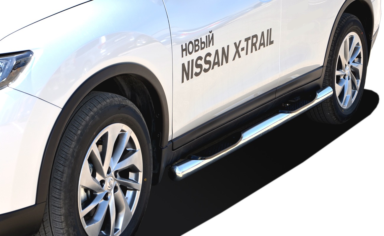 Пороги труба с пластиковыми накладками. Диаметр 76 мм. Сделаны из нержавеющей полированной стали. Марка стали AISI 304, Италия. Толщина стенки 1.5 мм. Пороги подходят для автомобиля NISSAN X-Trail (Ниссан Х-Трейл) с 2015 по сентябрь 2018 года выпуска.
