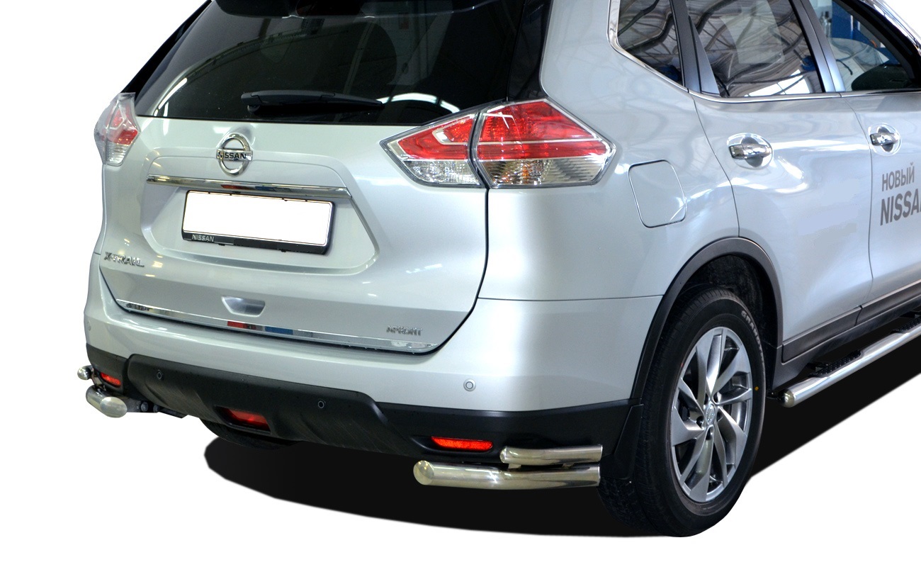 Защита заднего бампера "уголки двойные длинные" из нержавеющей полированной стали. Диаметр 60-42 мм. Толщина стенки 1.5 мм. Марка стали AISI 304, Италия. Защита задняя подходит на автомобиль NISSAN X-Trail (Ниссан Х-Трейл) с 2015 по сентябрь 2018 года выпуска.
