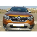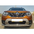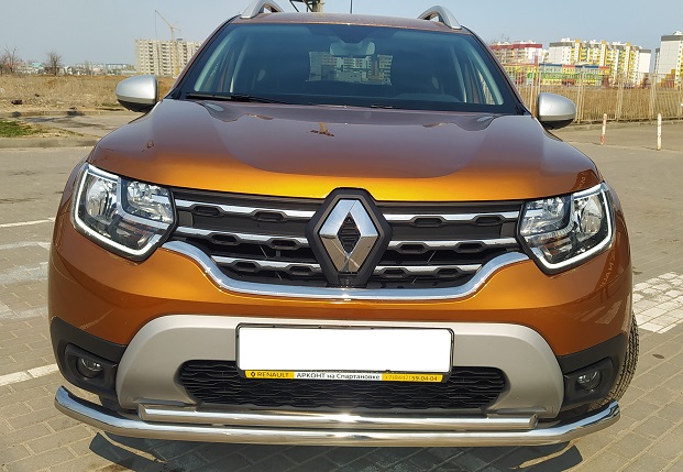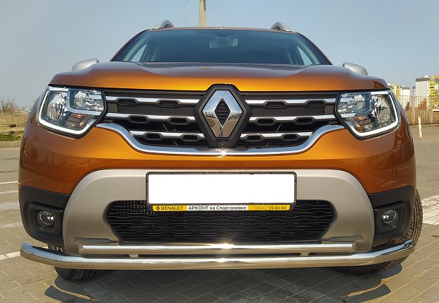 Защита переднего бампера двойная из нержавеющей, полированной стали. Диаметр трубы 60-42 мм. Толщина стенки 1,5 мм. Марка стали AISI 304, Италия. Защита бампера подходит для автомобиля RENAULT Duster (Рено Дастер) с 2021 года выпуска.