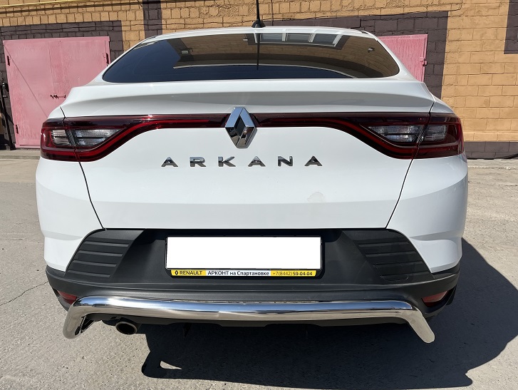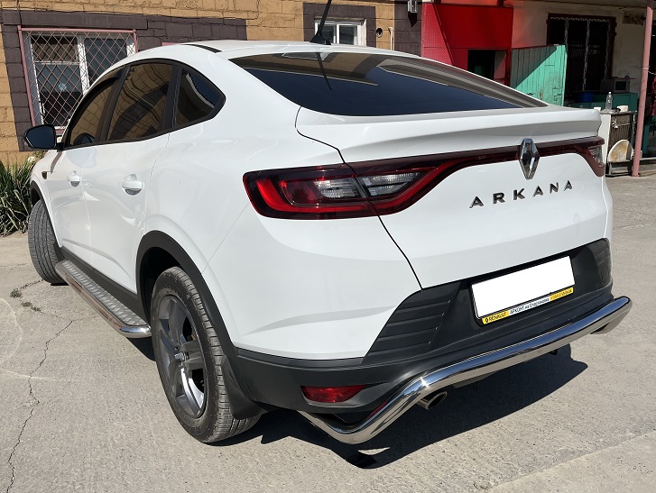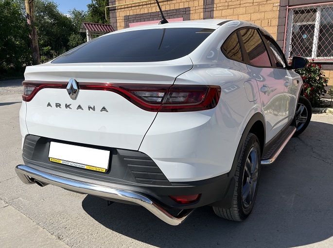 Защита заднего бампера "скоба" из нержавеющей, полированной стали. Диаметр трубы 60 мм. Толщина стенки 1,5 мм. Марка стали AISI 304, Италия. Защита бампера подходят для автомобиля RENAULT Arkana (Рено Аркана) с 2019 года выпуска.