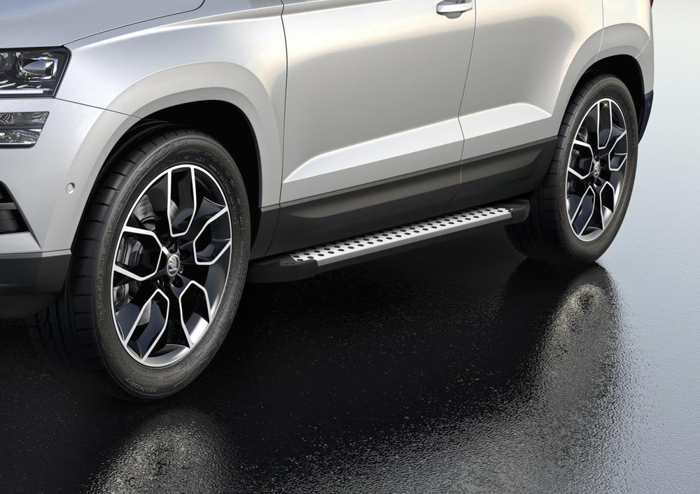 Пороги алюминиевые "BMW-style D". Пороги подходят для автомобиля Skoda Karoq (Шкода Карок) с 2020 года выпуска.