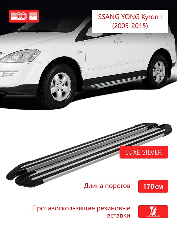 Пороги подножки алюминиевые "Luxe Silver" 1700 мм SSANG YONG Kyron. Подходят для автомобиля SSANG YONG Kyron с 2005 по 2015 год выпуска.