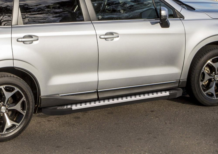 Пороги алюминиевые "BMW-style D". Пороги подходят для автомобиля SUBARU Forester (Субару Форестер) с 2013 года выпуска.