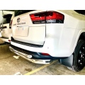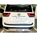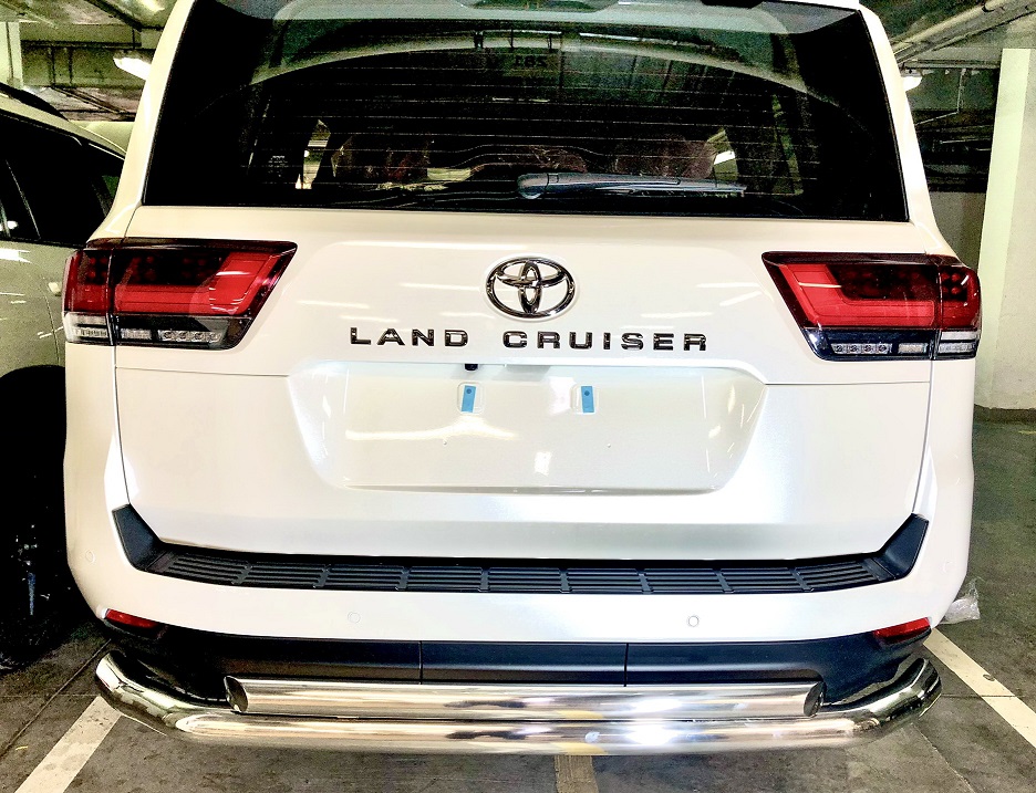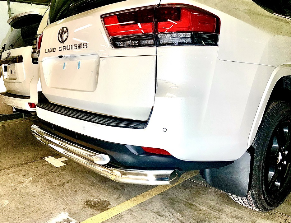 Защита заднего бампера двойная из нержавеющей, полированной стали. Диаметр трубы 76-60 мм. Толщина стенки 1,5 мм. Марка стали AISI 304, Италия. Защита бампера подходит для автомобиля TOYOTA Land Cruiser 300 (Тойота Ленд Крузер 300) комплектация "Комфорт Плюс" с 2021 года выпуска.