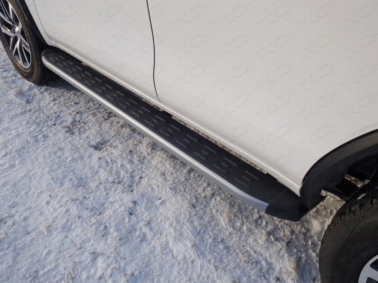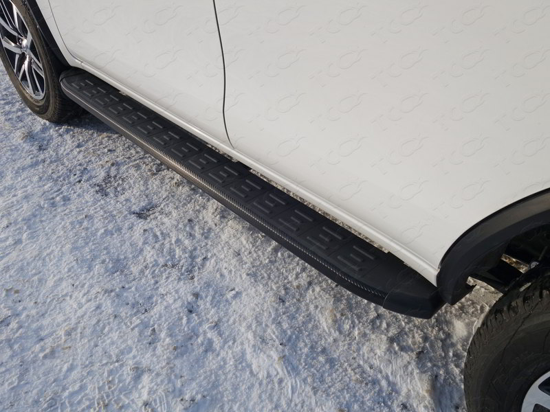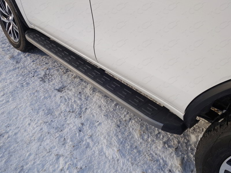Пороги алюминиевые с пластиковой накладкой карбон (серебро, серые, черные). Длинна порогов 1820 мм. Пороги подходят для автомобиля Toyota Fortuner (Тойота Фортунер) с 2020 года выпуска.