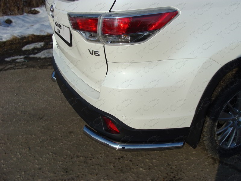 Защита заднего бампера из нержавеющей, полированной стали "уголки". Диаметр трубы 60 мм. Толщина стенки 1,5 мм. Марка стали AISI 304, Италия. Защита бампера подходит для автомобиля TOYOTA Highlander (Тойота Хайлендер) с 2014 года выпуска.