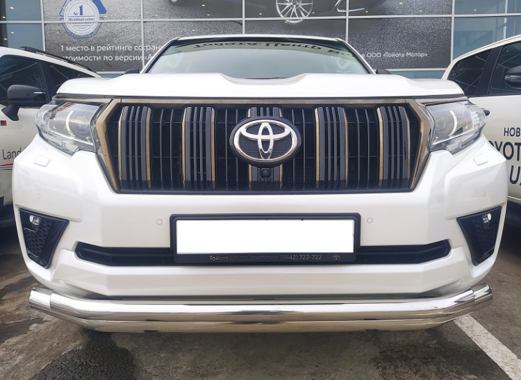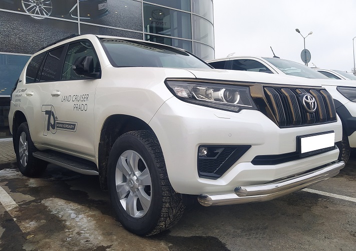 Защита переднего бампера двойная с подгибами из нержавеющей, полированной стали. Диаметр трубы 76-60 мм. Толщина стенки 1,5 мм. Марка стали AISI 304, Италия. Защита бампера подходит для автомобиля TOYOTA Land Cruiser 150 Prado (Тойота Ленд Крузер 150 Прадо) с 2017 года выпуска.